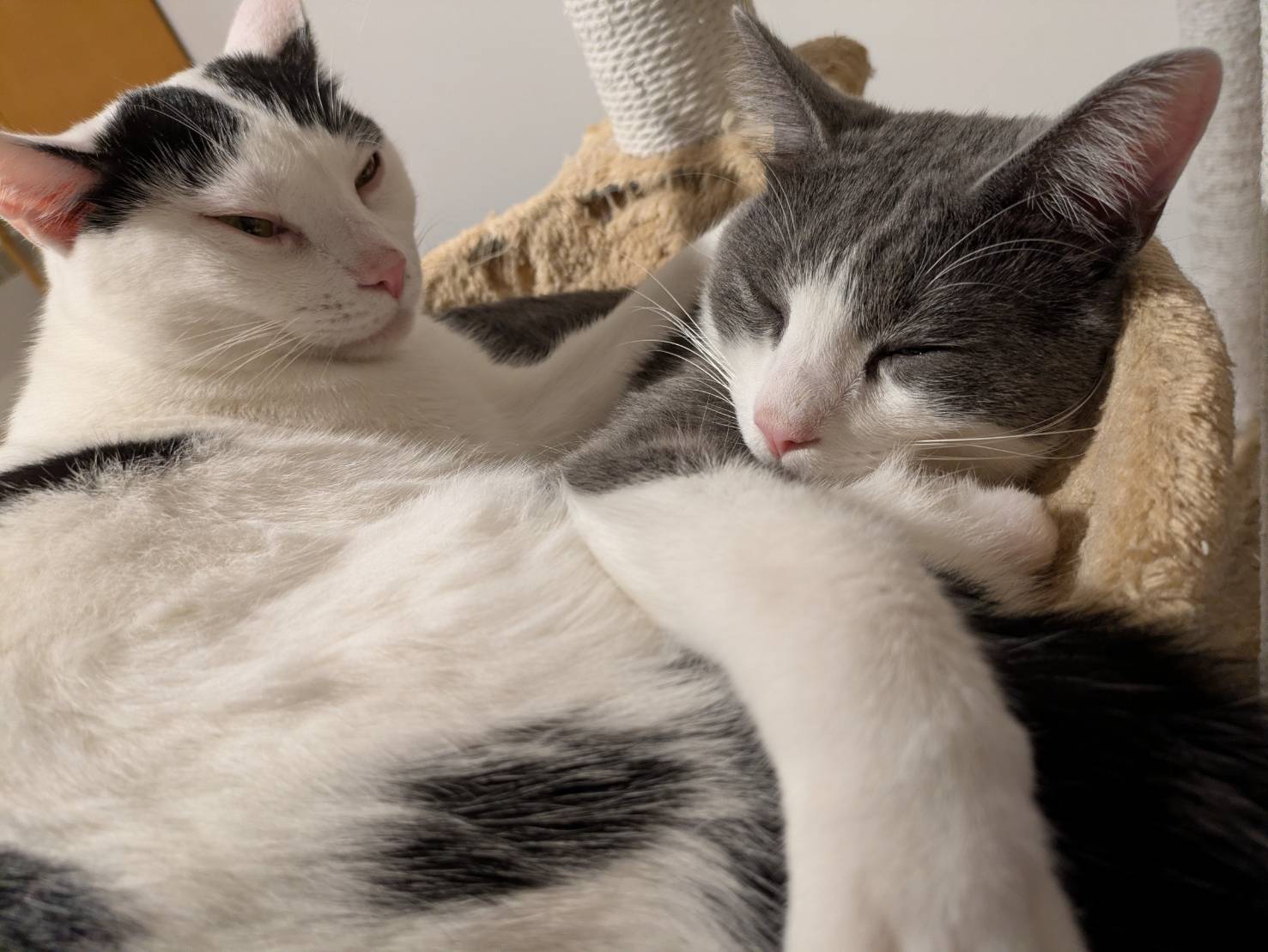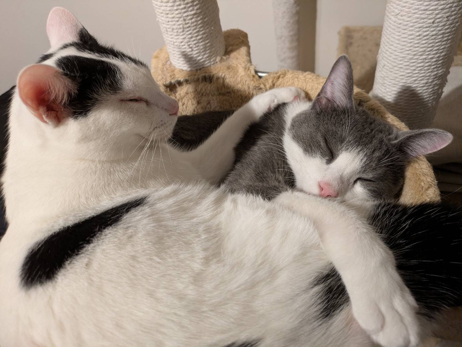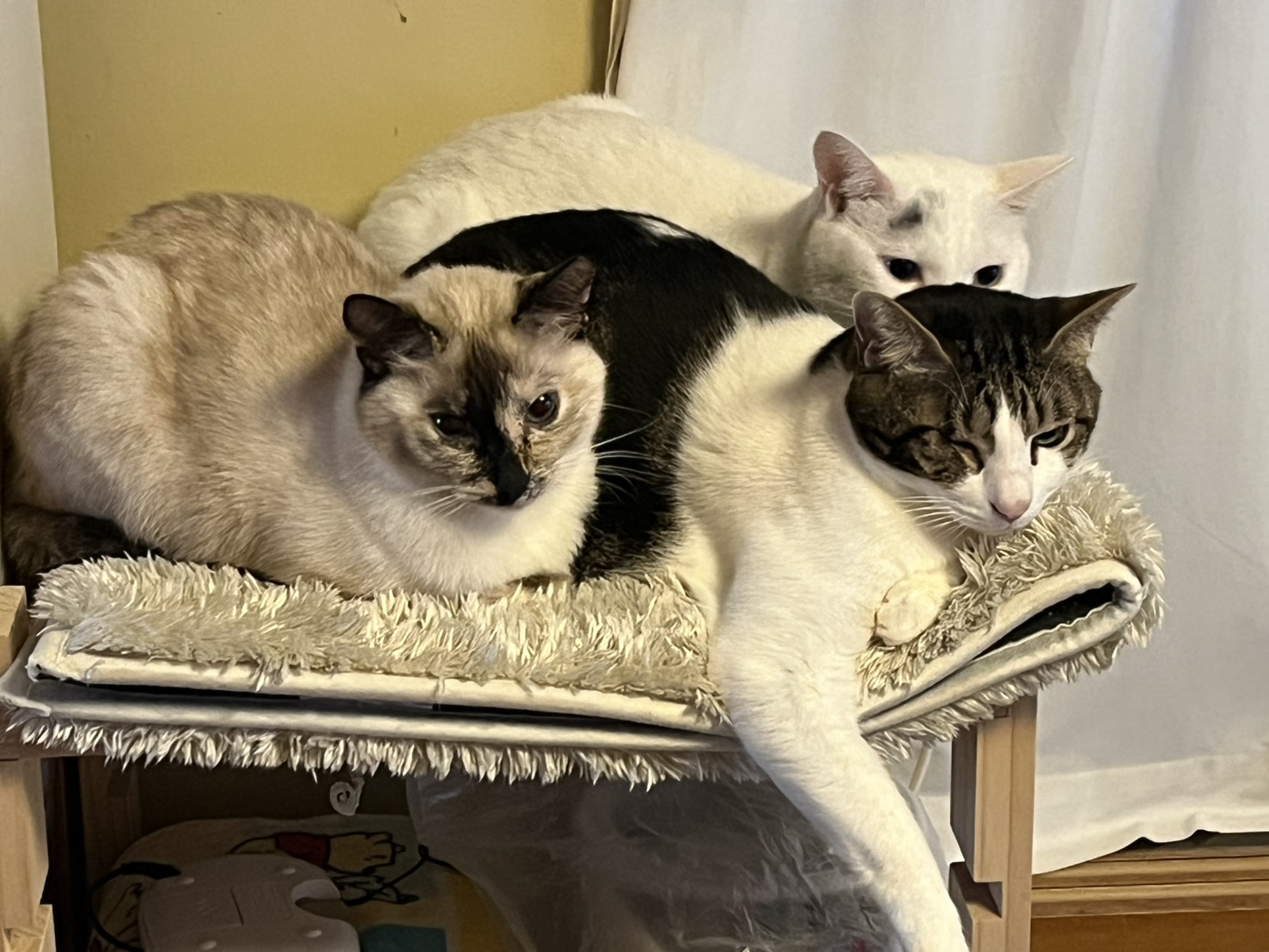2025年12月5日 お団子の季節 朝が堪えるようになりました。 目覚めは良い方ですが寒くて時間に起きられません。 目覚ましセット⏰必須の季節です。 もう一つ、団子のシーズンでもあります。 そう、あのかわいい団子、猫団子の季節がやって来ました♪ 見ているとほっこりします ⬇️これは天&るるちゃん団子 ⬇️これはマロン&寧々ちゃん母娘団子 ⬇️起きている団子🍡です。 モカ&梵&大福くん、冬が来るとこの通り♪ なかよし♪