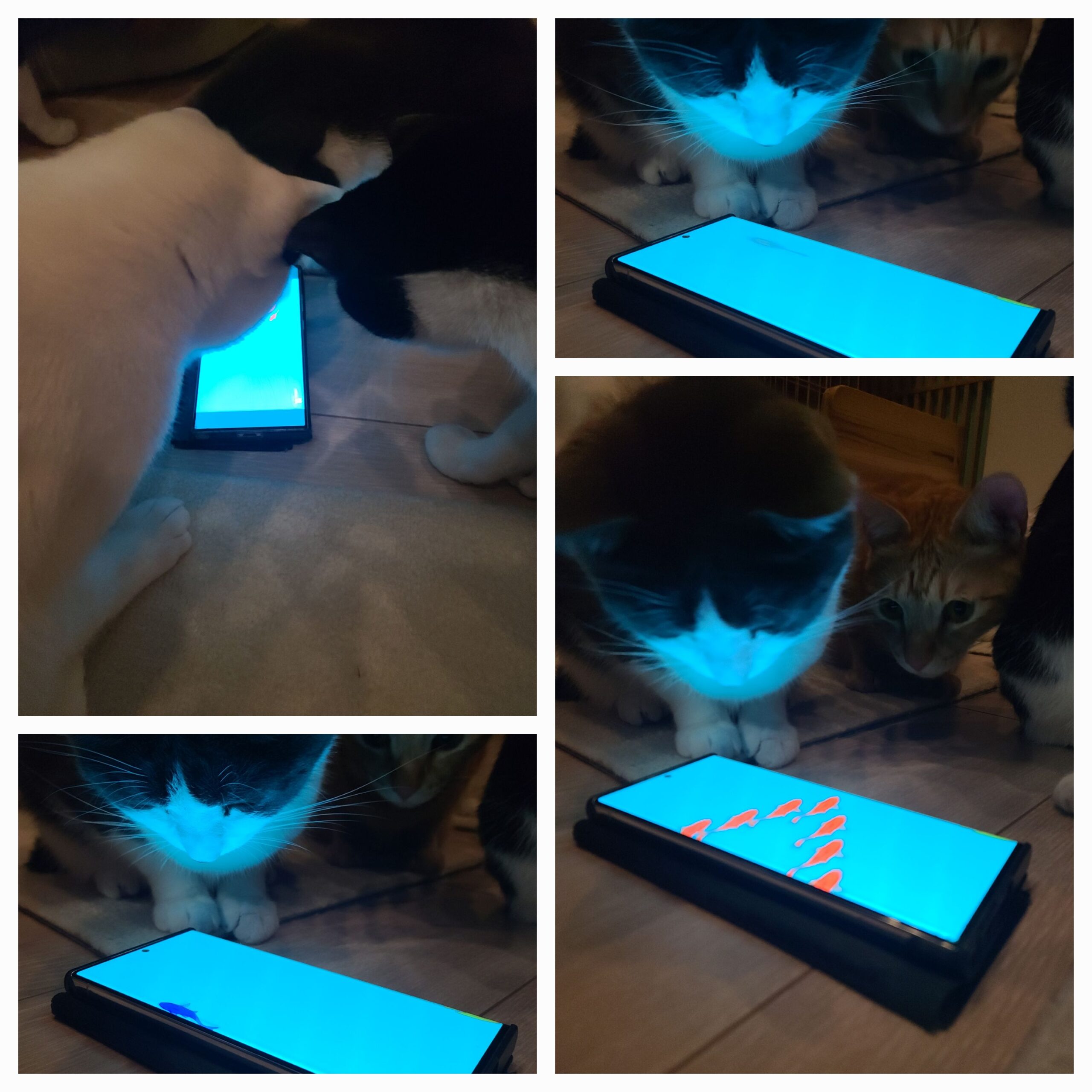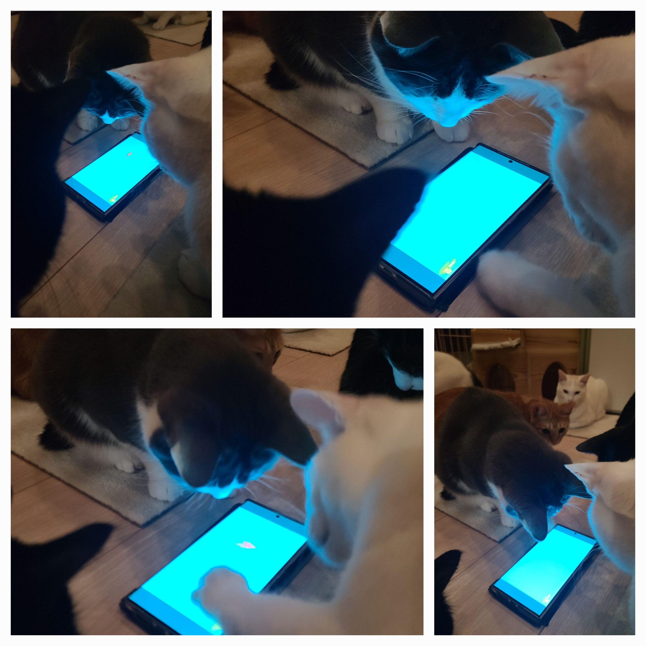 2026年2月7日 夜の団欒 寒いです。 雪がふりましたね! そんな日も猫部屋のみんなはいつも通り、お部屋でのんびり、夜長を楽しんでいるようです 夜のスナックタイムの後、羽根のおもちゃで運動してます。 各々が頑張って全力走りです! 少し走り回るのも疲れたので、今夜は床に寝そべって猫用の動画をみんなで観ました! 紐、ネズミ、ネコの顔、金魚、鳥の鳴き声、カサカサという袋の音… 猫は画面に吸い寄せられますねー、観ない訳にいかないようですよ