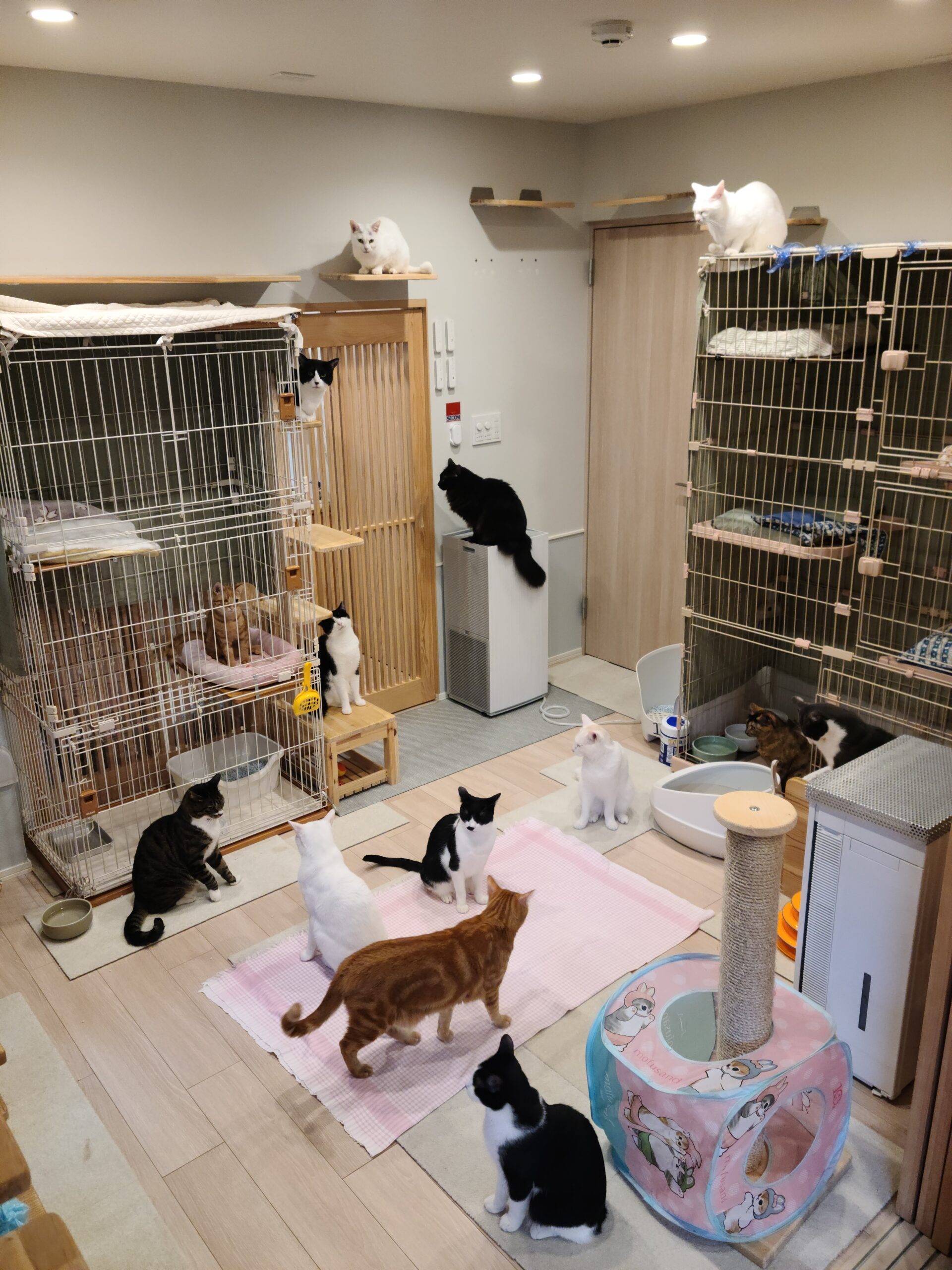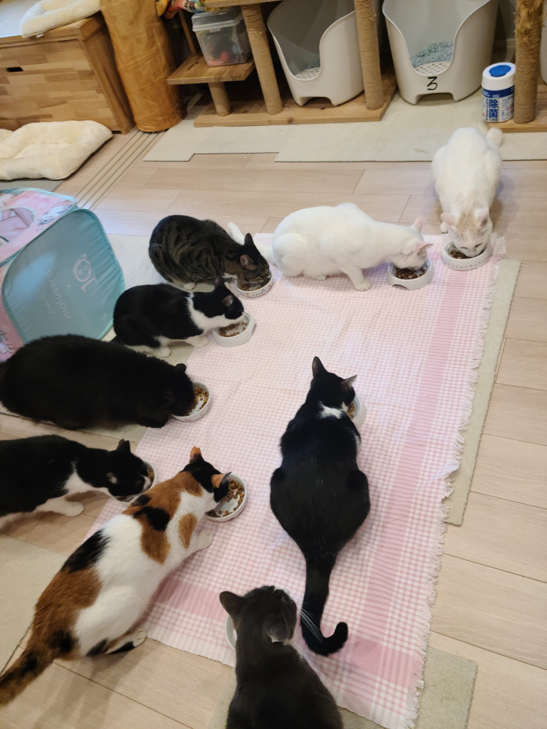 今朝も猫部屋は食欲旺盛な猫たちの熱気で明けました! 待ちきれずにうろうろと回遊する猫だらけになり、みんな腹ペコのイラつき状態。 小競り合いが始まり、女子のミーちゃんが揉み合いの中で「キャーッ」と叫びます。 ピンクのチェック模様のクロスが敷かれると朝ごはん配給の合図。 お皿でご飯が配られると一気に集中! 静かな部屋にカリッカリッという咀嚼音が響きます。 今朝もみんな美味しそうに食べていますね。 この光景を眺めているのも好きな世話人です。